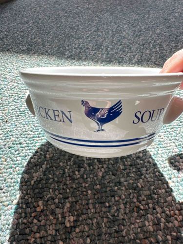 This is a set of eight vintage-style soup bowls, often referred to as 'soup mugs' or 'crocks' due to their integrated side handles and deep, rounded profile. These specific items were produced by FTD (Florists' Transworld Delivery) in Korea, likely during the late 20th century, specifically the 1980s, when FTD frequently commissioned ceramic and glass giftware. The material is a white milk glass or dense ceramic with a glossy finish. The exterior features a prominent cobalt blue transferware design consisting of a stylized hen in the center, flanked by the words 'CHICKEN' on the left and 'SOUP' on the right in a classic serif font. Two horizontal blue pinstripe bands wrap around the base, adding a country-style aesthetic. The construction includes two small, pointed tab handles on opposite sides for ease of carrying hot contents. Given the provided context of 'good condition,' the bowls appear to have minimal wear with no visible cracking, chipping, or significant fading to the blue graphics. The glaze remains bright and uniform. These mass-produced items are valued for their nostalgia and sturdy, functional design in a country-kitchen style.