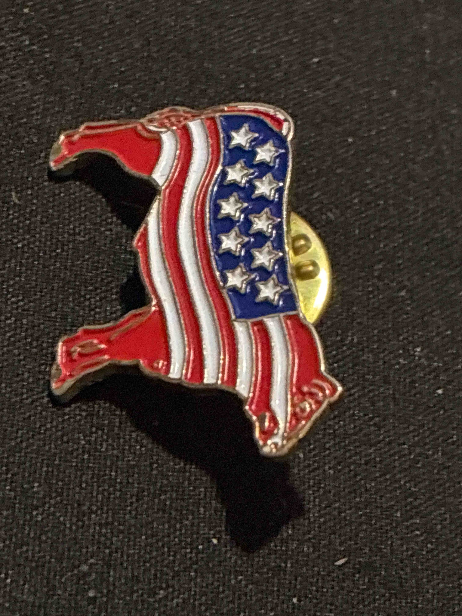 This is a die-struck enamel lapel pin featuring the stylized Republican Party elephant silhouette, decorated with the stars and stripes motif of the United States national flag. The piece is constructed from a gold-tone base metal, possibly brass, utilizing a cloisonné-style or soft enamel technique to create the vibrant red, white, and blue sections. The blue canton contains ten visible stars, which are raised metal reliefs within the enamel field. Physically, the pin is small, approximately 0.75 to 1 inch in size, and features a standard butterfly clutch (damit) or pinch-back fastener visible on the reverse. The craftsmanship displays clean metal lines separating the enamel colors, a hallmark of mass-produced promotional or political jewelry from the late 20th or early 21st century. The condition appears to be used but good; there is visible tarnishing and light oxidation on the exposed metal borders and the rear fastener, which suggests some age and handling. No maker's marks are visible on the front, which is typical for these types of political campaign accessories. The style is contemporary conservative political memorabilia, frequently distributed at conventions, rallies, or local party offices.