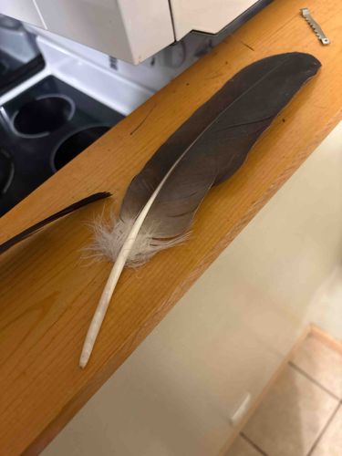 This is a single primary flight feather from a large bird, likely of the accipitrid family, such as a large hawk or eagle. The feather measures approximately 10 to 12 inches in length. It features a robust, opaque white calamus (quill) and rachis, which provides significant structural integrity. The vane is asymmetrical, characteristic of primary flight feathers, with a dark slate gray to brownish-black coloration that transitions into a lighter, silvery-gray hue towards the base. At the proximal end of the rachis, there is a visible amount of white downy barbs (semi-plumes) which serve as insulation for the bird. The feather appears to be in relatively stable condition, though it shows some minor splitting and ruffling along the distal edges (fraying), which is common in naturally shed feathers. There are no signs of artificial dyes, treatments, or commercial manufacturing labels, suggesting it is a biological specimen rather than a decorative craft item. Of significant note is the legal status: if this specimen is determined to be from a migratory bird or a protected bird of prey (like a Bald or Golden Eagle), possession may be regulated or prohibited under the Migratory Bird Treaty Act or the Bald and Golden Eagle Protection Act.