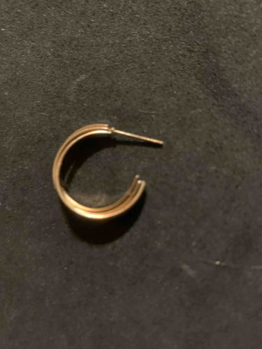 This item is a single gold-toned hoop earring designed for pierced ears. The piece features a distinct 'double-hoop' or 'ribbed' aesthetic, where two parallel semi-circular bands are joined together to form the main body of the earring. The construction is hollow or open-backed, suggesting a lightweight design intended for comfortable daily wear. The metal exhibits a warm, yellow-gold color with a polished finish, though there are visible signs of surface tarnish and oxidation, particularly near the post and the internal crevices where the bands meet. This indicates it may be gold-plated base metal or a lower-karat gold alloy. The straight post is attached to one end of the hoop and appears slightly bent from use. No visible maker's marks or hallmarks (such as 14K or 925) are clearly identifiable in the current view, which is common for contemporary costume jewelry. The style is minimalist and modern, likely dating from the late 20th to early 21st century. The overall condition shows signs of moderate use, including minor scratches, dulling of the finish, and the aforementioned slight deformation of the post. The earring is missing its corresponding pair and the butterfly clutch backing.