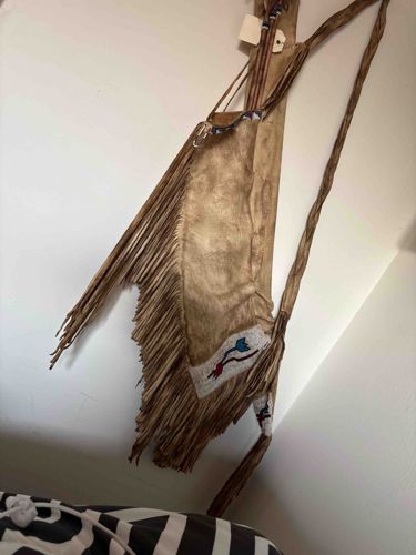 This item is a decorative bow case and quiver set, crafted in a traditional Native American style, likely Plains Indian inspired. The set is constructed from brain-tanned or commercially smoked buckskin, displaying a characteristic tan/ochre color with a soft, sueded texture. The primary body features extensive long-cut fringe along the seams and bottom edges, which serves both an aesthetic and functional purpose. Notable decorative elements include glass seed beadwork panels featuring geometric or floral motifs in colors of white, blue, and red. A distinct beaded section near the bottom shows a stylized floral or feather design. The construction utilizes hand-stitched seams and long buckskin carrying straps. The item appears to be of 20th-century manufacture, likely intended for the regalia or collector market rather than purely utilitarian historical use. Condition-wise, the leather shows some natural variation in color and minor stiffening, with visible creasing near the top. The beadwork appears mostly intact, though there is general surface dust. The fringe is decently preserved with no major loss or matting observed. This piece demonstrates quality craftsmanship in the leatherwork and bead application, reflecting traditional Great Plains cultural designs.