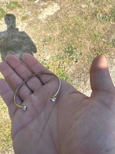This item is a contemporary-style open cuff or 'bypass' style bracelet, currently held in a person's palm for scale. It is constructed from a thin, tubular metal band featuring a gold-toned or yellow-metallic finish over a likely base metal. The bracelet terminates in two circular bezel settings, each housing a single faceted clear stone, likely cubic zirconia, glass, or crystal. These stones are round-cut and approximately 4-5mm in diameter. The overall design is minimalist and delicate, characterized by its clean lines and symmetrical end-caps. Regarding condition, the metal shows significant signs of surface wear and oxidation; there is noticeable darkening and a greenish-grey tarnish appearing along the inner and outer curve of the band, suggesting the primary gold plating has worn away through friction or environmental exposure. No visible maker's marks, hallmarks, or metal purity stamps (such as "14k" or "925") are discernible in the image, further suggesting it is a piece of fashion or costume jewelry rather than fine jewelry. Its style is indicative of mass-produced accessories from the late 20th or early 21st century. The craftsmanship is functional but lacks the high-end finishing seen in luxury pieces, particularly evidenced by the uneven patina and standard bezel settings.