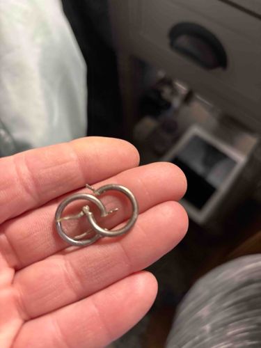 A pair of small, circular hoop earrings held between the fingertips. These earrings appear to be made of sterling silver, though a hallmark is not clearly visible in the image. Each hoop measures approximately 10mm to 12mm in diameter, categorized as 'huggie' or small classic hoops. The metal exhibits a significant amount of tarnish and surface oxidation, typical of older silver that has been exposed to air without regular polishing, resulting in a dull, greyish patina. The construction features a simple curved ear wire that clicks into a notch at the back of the hoop, known as a saddle or latch-back closure. The wire on at least one earring appears slightly bent or distorted from use. There are no visible gemstones or decorative etchings, suggesting a minimalist, modern style likely dating from the late 20th century to the present. The gauge of the silver tubing is relatively thin, indicating light-weight comfort for daily wear. Overall condition is fair, needing professional cleaning and possible realignment of the fastening wires to restore original luster and functional integrity.