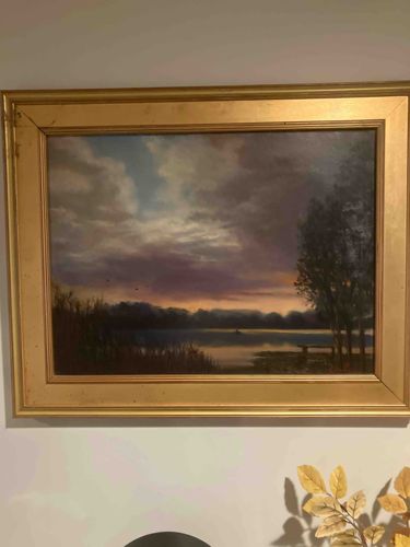 This is an original oil or acrylic painting on canvas or board by American artist David Olander, depicting a serene landscape of Round Lake at dusk or dawn. The composition features a dramatic sky filled with voluminous clouds tinged with purples, pinks, and yellows, reflecting the low light of a setting or rising sun. The foreground showcases dark, silhouetted marsh grasses on the left and a cluster of slender trees on the right, framing a calm body of water. A small, distant boat or structure is visible on the lake's surface, adding a sense of scale and tranquility to the scene. The color palette is dominated by moody blues, deep violets, and warm earth tones. The work is housed in a modern, wide-profile wooden frame with a metallic gold finish and a subtle cove molding. The painting appears to be in overall good condition, though the frame shows minor signs of age-related wear, including small abrasions and light surface dust. The brushwork is impressionistic yet deliberate, demonstrating high-quality craftsmanship in the handling of light and atmospheric perspective characteristic of Olander's late 20th-century style.