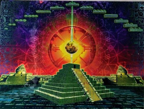 This is a vibrant and complex memorabilia poster featuring a psychedelic take on Mesoamerican iconography. The central focus is a green stepped Mayan-style pyramid, rendered with digital precision, leading up to a beam of light that strikes a circular celestial orb. The background is a dense tapestry of deep purples, fiery reds, and golden yellows, depicting a cosmic sun or galactic core. Ornate geometric patterns reminiscent of the Aztec sun stone or Mayan calendar wheels are overlaid throughout the composition. Flanking the central pyramid are two smaller structures with domed features under a nebula-like sky. Floating green platforms and glyph-like symbols are arranged along the upper border, suggesting a futuristic or sci-fi interpretation of ancient history often associated with 'Ancient Astronaut' theories or 2012-era New Age spiritualism. The colors are highly saturated, and the digital layering indicates modern printing from the late 20th or early 21st century. The artwork shows high contrast and sharp line work, typical of professional large-format graphic prints on mid-weight paper stock. No visible tears or significant creases are apparent in this copy, though the edges are cropped in the image. There are no obvious maker's marks or artist signatures visible on the face of the art, suggesting it may be a decorative commercial fan-poster or atmospheric print.