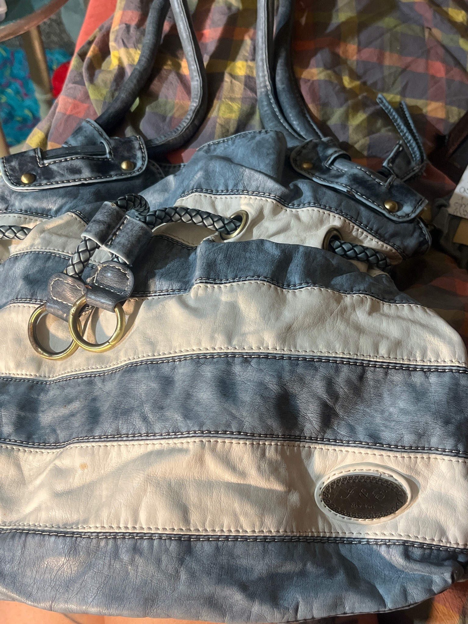 This is a contemporary-style drawstring tote bag by the brand J&C New York. The construction features horizontal tiered stripes of supple, textured leather in alternating shades of washed slate blue and cream. The leather exhibits a distinct pebbled and slightly distressed finish, characteristic of late 2000s or early 2010s urban fashion accessories. A central feature is the braided leather drawstring that threads through reinforced brass-tone metal eyelets, terminating in two large brass-tone circular rings. The bag is equipped with dual rounded leather carry straps attached to the body via studded leather tabs with brass hardware. The lower right quadrant features an oval leather logo patch embossed with 'J & C New York' set within a cream leather frame. Regarding condition, the bag shows visible signs of moderate use; there is a small brown stain on the lower cream stripe and noticeable scuffing/color loss on the blue leather edges, particularly along the bottom seam. The metal hardware shows some minor surface oxidation or patina consistent with age and frequent handling. The craftsmanship is mid-range, utilizing decorative heavy-contrast topstitching to define the striped panels, though several areas show wrinkling and loss of shape typical of soft-sided leather goods.