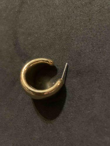This item is a singular chunky C-style hoop earring, characterized by its thick, rounded tubular design. The piece features a gold-tone finish that exhibits a reflective, polished surface typical of contemporary fashion jewelry. The earring utilizes a traditional post-and-butterfly closure mechanism, though the butterfly backing is missing in the photograph. The post itself appears to be made of a different metal alloy, likely surgical steel or sterling silver to accommodate skin sensitivities, showing a distinct silver-white color contrast against the golden body. In terms of condition, the item shows various micro-scratches and minor surface abrasions consistent with regular use. There is noticeable tarnishing or loss of plating near the joint where the post meets the hoop, revealing a darker base metal underneath. The construction suggests it is a mass-produced item from the late 20th or early 21st century, likely composed of a hollow brass or zinc alloy base with a gold-colored electroplated coating. The absence of a visible hallmark or designer stamp on the inner curve of the hoop suggests it is a high-street or non-designer accessory. The scale appears to be mid-sized, approximately 15-20mm in diameter, emphasizing a bold, minimalist aesthetic.