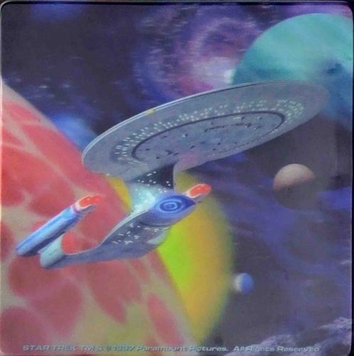 This item is a vintage lenticular three-dimensional (3D) print featuring the U.S.S. Enterprise NCC-1701-D from the television series 'Star Trek: The Next Generation.' Published in 1987, the year the series premiered, the artwork displays a highly stylized, colorful space vista. The galaxy-class starship is positioned in the foreground, showing the saucer section, secondary hull, and glowing red warp nacelles. The background is composed of vibrant nebulae in shades of purple, blue, and pink, along with several planets including a large gas giant to the right and a reddish planetoid to the left. The print utilizes lenticular technology—composed of a plastic grooved lens overlay—to create a sense of depth and motion as the viewer shifts their perspective. Along the bottom edge, there is visible copyright text that reads 'STAR TREK TM & © 1987 Paramount Pictures. All Rights Reserved.' The print size is approximately 1442 x 1449. The colors remain saturated, though the surface shows typical age-related wear, including minor scuffing on the plastic lens and rounded corners. This piece represents an early piece of promotional or retail merchandise released at the dawn of the TNG era, showcasing 1980s special-effects aesthetics and printing techniques. The craftsmanship is consistent with mass-produced collectible novelties of the late 20th century.
