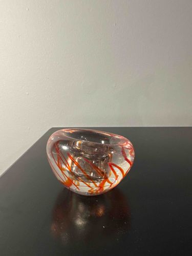 This item is a heavy, hand-blown art glass votive or tealight candle holder, likely produced in the late 20th century. The piece features a 'Sommerso' style construction, where a core of clear glass encases decorative elements. In this instance, the internal decoration consists of vibrant, organic orange-red swirls and threads that appear to float suspended within the thick, transparent glass walls. The form is a rounded, asymmetrical 'pebble' or 'stone' shape, indicative of mid-century modern or contemporary Scandinavian and Murano design influences. It possesses a polished, flat base and a deep central cylindrical cavity intended to hold a standard tealight. The glass exhibits high clarity and a substantial weight, suggesting quality lead crystal or high-grade soda-lime glass composition. There are no visible maker's marks, signatures, or acid-etched stamps in the provided view, though the craftsmanship suggests a professional studio origin. The condition appears excellent with a high-gloss finish; however, close inspection of the base would be required to identify any shelf wear or micro-scratches typical of vintage glass. The use of fluid, energetic color lines against the stark transparency of the bulbous form creates a dynamic visual effect, catching light from multiple angles.