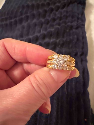 This is a yellow gold multi-stone ring set, likely a bridal set consisting of a central engagement ring and a form-fitting double-row enhancer or guard, giving the appearance of three stacked bands. The primary metal presents as high-karat yellow gold (potentially 14K or 18K), characterized by a deep, rich luster. The center focal point features a cluster of seven round brilliant-cut diamonds arranged in a floral or snowflake pattern, which creates the illusion of a larger single stone. This central cluster is flanked by two outer bands, each pavé or channel-set with smaller round brilliant diamonds that trail down the shoulders of the shank. The construction is robust, featuring traditional prong settings for the larger stones. In terms of condition, the gold shows minor surface abrasions consistent with regular wear, and the stones appear securely seated, though there is some dullness suggesting a need for cleaning to restore maximum fire and brilliance. The style is indicative of late 20th-century design (circa 1980s-1990s), focusing on a maximalist aesthetic and significant finger coverage. No maker's marks are visible from this orientation, but the craftsmanship suggests a commercial fine jewelry production of good quality.