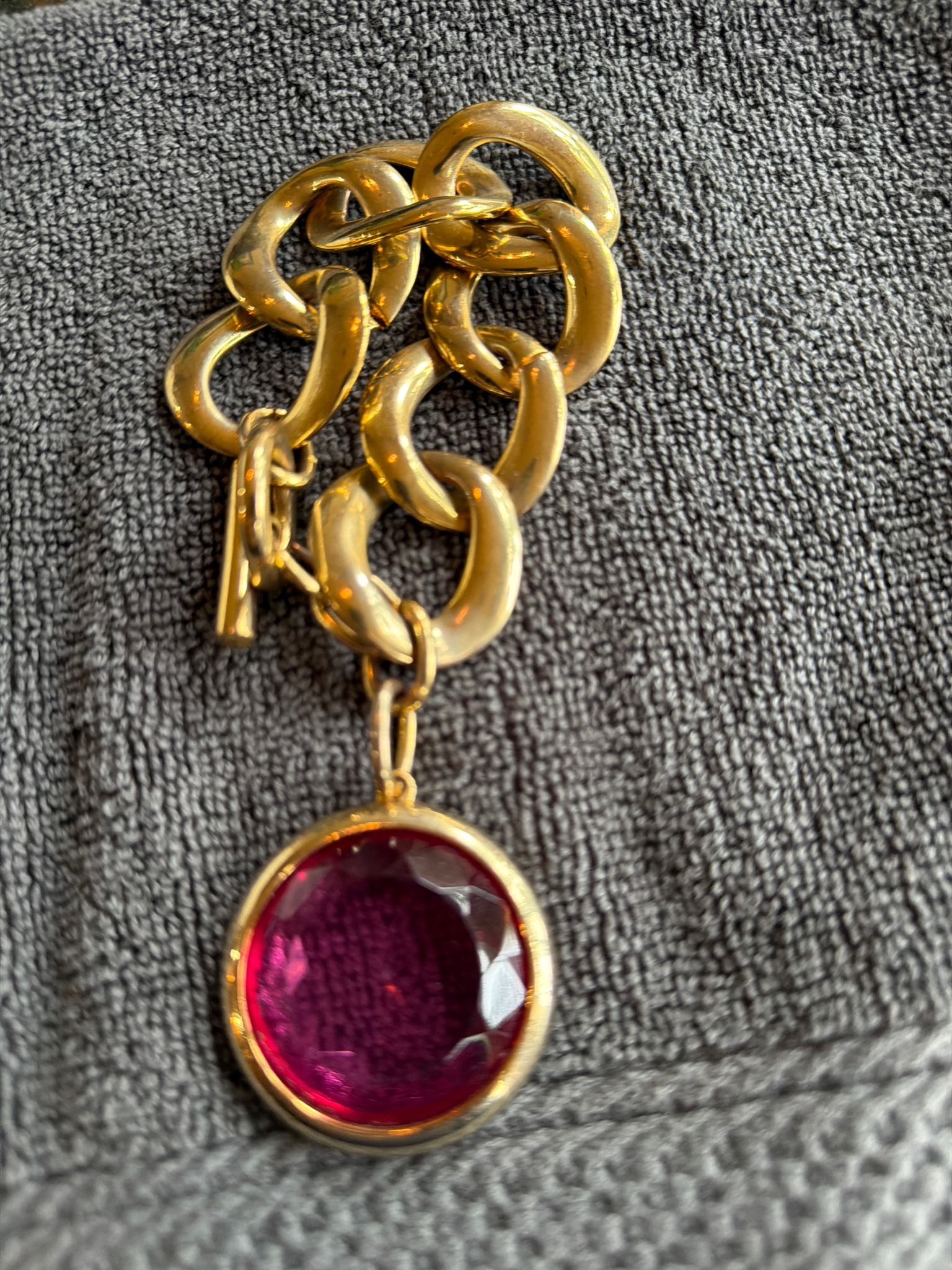 This piece is a bold, chunky vintage costume jewelry bracelet featuring a heavy yellow gold-tone curb link chain. The chain is constructed of large, rounded open-oval links with a high-polish finish. It is secured by a classic toggle clasp assembly. Suspended from the terminal link via a simple jump ring is a large, circular bezel-set pendant. The pendant features a vibrant fuchsia-pink faceted glass stone with a deep table and brilliant-cut faceting across the surface. The bezel is substantial, mirroring the thick aesthetic of the chain links. Regarding condition, there is visible surface wear typical of mid-to-late 20th-century costume jewelry, including light scuffing and minor discoloration or 'brassing' on the high points of the links where the gold plating has thinned. No maker's marks are immediately visible in the image, suggesting it may be a high-quality boutique or department store piece from the 1980s or 1990s. The overall craftsmanship is sturdy, with a focus on a 'statement' aesthetic popular in late-century fashion. The fuchsia stone appears intact without major chips, though faint abrasions are present on the facet edges consistent with moderate use.