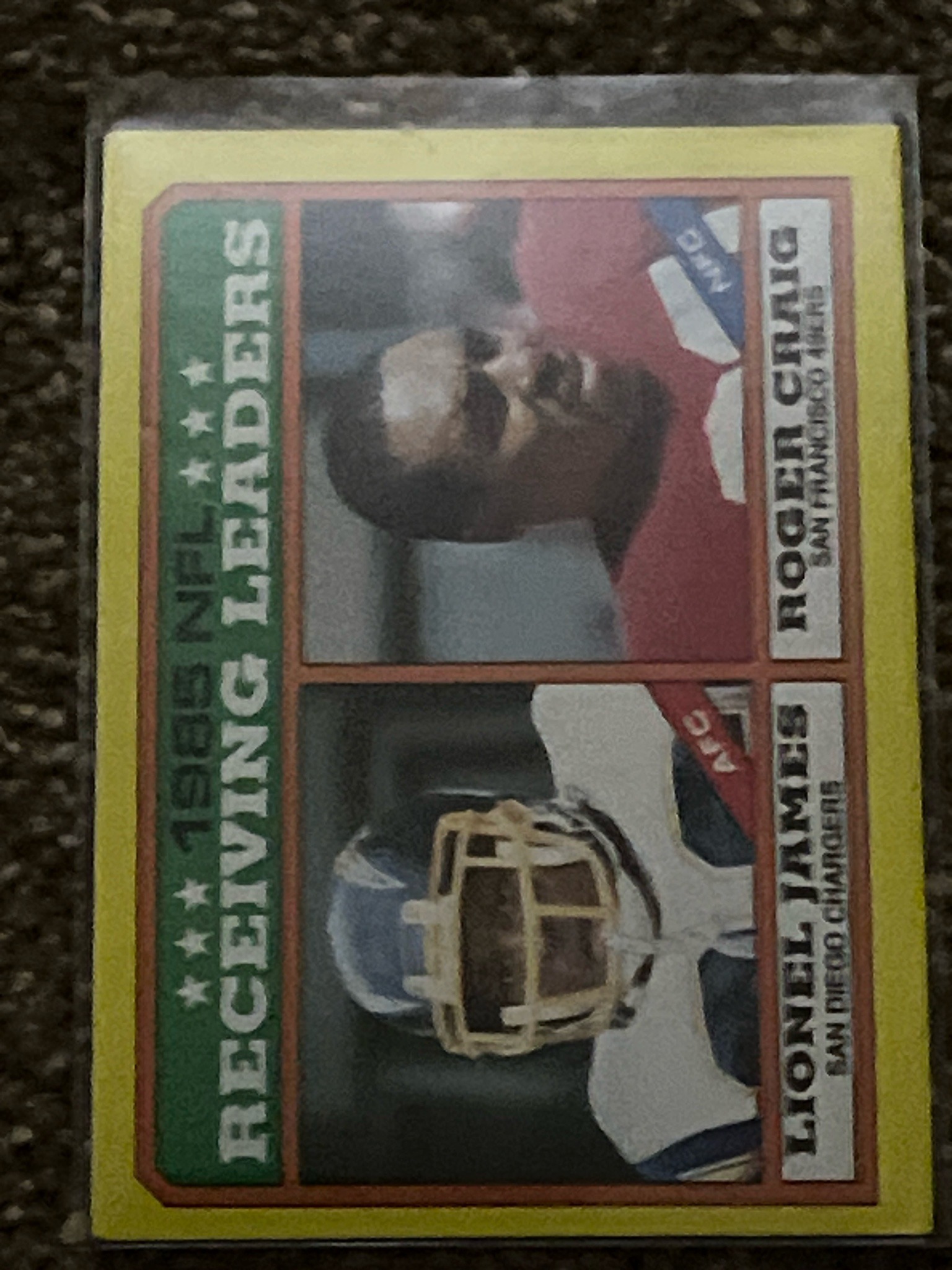 This is a vintage 1986 Topps football card featuring the 1985 NFL Receiving Leaders, Roger Craig of the San Francisco 49ers and Lionel James of the San Diego Chargers. The card displays a vibrant yellow outer border with a green inner banner reading '1985 NFL RECEIVING LEADERS' flanked by stars. The card depicts two separate photographic portraits of the players in their team uniforms. Roger Craig is shown in his red 49ers jersey, while Lionel James is pictured in his Chargers helmet and white jersey. The card is printed on standard semi-glossy cardstock of the era. Regarding condition, the card appears to be housed in a clear protective sleeve. There are visible signs of wear consistent with age, including softening and slight rounding of the corners. The centering of the image appears slightly shifted toward the top right edge. There is some minor surface scuffing visible on the plastic sleeve which may or may not affect the card itself. No major creases or staining are immediately apparent from the obverse view. The printing quality shows characteristic 1980s halftone patterns. This piece represents a significant era in NFL history, highlighting two versatile running backs who led the league in receptions during the 1985 season.
