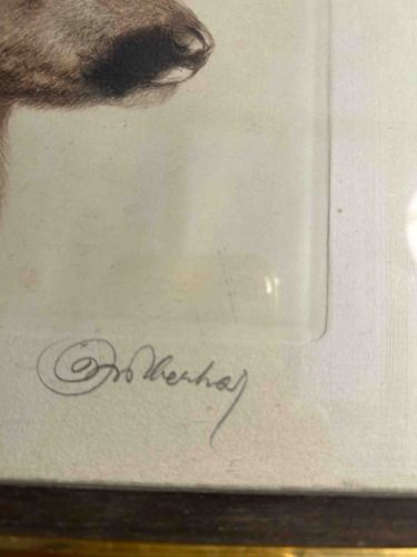 This item is an original watercolor painting on paper, focused on a realistic rendering of a deer's head. The artwork displays a high level of technical skill, particularly in the stippled and layered brushwork used to create the texture of the fur and the moist appearance of the deer's nose. The color palette is naturalistic, composed of warm ochres, deep burnt umbers, and subtle grey undertones. A significant distinguishing feature is the presence of an artist's signature in the lower left corner, executed in a fluid, cursive hand with a distinctive circular flourish on the leading initial. The work is housed under glass within a matted frame. Regarding condition, there are visible signs of foxing and small reddish-brown oxidation spots scattered across the upper and lower margins of the paper, typical of older works on paper exposed to moisture or acidic environments. The paper substrate shows a slight rippling or 'cockling,' which is common for watercolor works on heavy-weight paper. The framing appears vintage, with a dark wood or gilded edge visible at the bottom. The style suggests a 20th-century natural history or sporting art aesthetic, emphasizing anatomical accuracy and soft, diffused light. The precision of the rendering indicates a professional hand proficient in wildlife illustration.