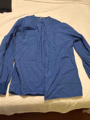 This item is a royal blue, long-sleeved medical scrub jacket designed for healthcare professionals. The garment is constructed from a lightweight, durable woven fabric typical of medical apparel, likely a polyester-cotton blend or a similar performance-based textile. It features a round, collarless neckline and a full-length front closure secured with a series of color-matched snap buttons. The jacket includes two large functional patch pockets located at the lower front hip area for utility. The sleeves are finished with gathered elastic or ribbed knit cuffs, which are a darker shade of blue than the main body, providing a snug fit for hygiene and safety. The overall construction displays industrial-grade stitching meant for frequent laundering. The condition of the item is fair to good; it shows significant surface wrinkling and creasing, suggesting it has been stored folded or was recently laundered without pressing. No prominent staining, tears, or fraying are immediately visible in the image, although there is a small white manufacturer's tag visible at the inner collar which may contain sizing and care instructions. The styling is contemporary, standard-issue medical workwear from the late 20th or early 21st century.