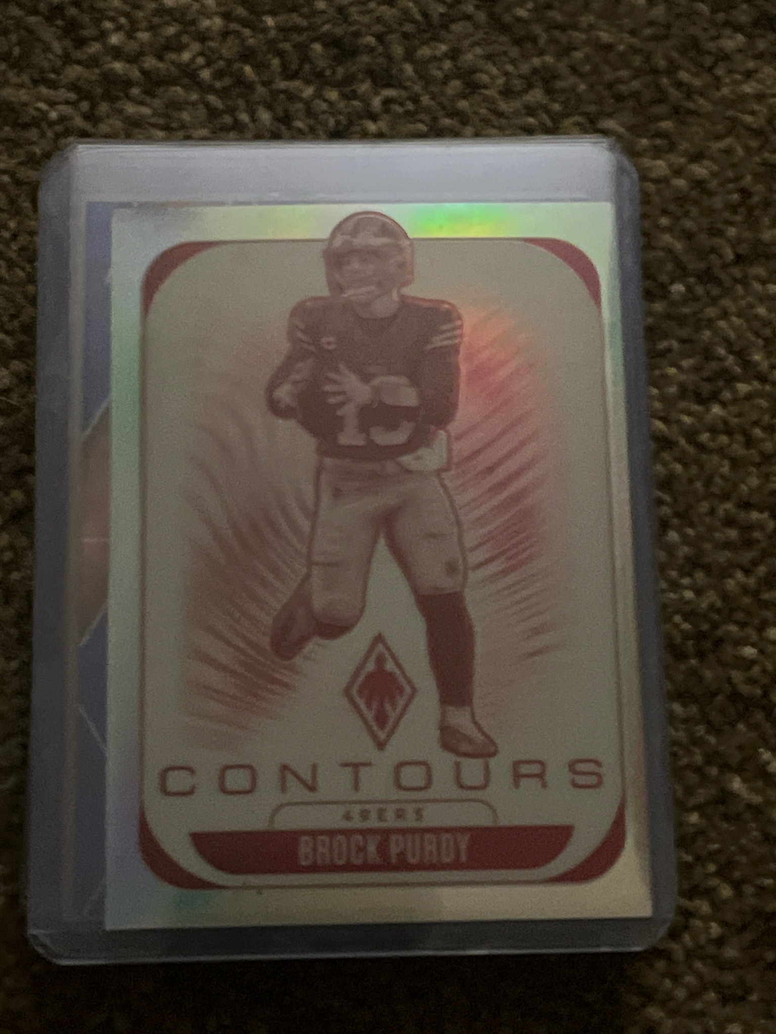 This is a modern sports trading card featuring San Francisco 49ers quarterback Brock Purdy, part of the 'Contours' insert set from the 2023 Panini Phoenix Football collection. The card exhibits a refractive 'Silver Prizm' or 'Holo' finish, which produces a rainbow-like spectrum when exposed to light, visible along the top and left edges. The central design depicts Purdy in an action pose using a monochromatic red-tinted illustrative style inside a rounded rectangular frame. Below the image is the 'Contours' branding, the team name '49ERS', and the player's name 'BROCK PURDY' in bold red lettering. The Panini Phoenix logo is centered below the figure. The card appears to be in excellent condition, housed within a protective semi-rigid plastic top-loader, which has preserved its corners and edges. The centering of the image and the text appears balanced relative to the card's borders. There is no visible surface scratching or corner wear through the plastic. The card represents a key modern collectible from a high-gloss, premium cardboard set manufactured by Panini America Inc., the exclusive license holder for NFL trading cards during this period. The 'Contours' set is known for its distinct artistic rendering of star players, making it a popular target for collectors and investors in the sports memorabilia market.
