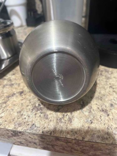 This is a contemporary stainless steel sugar bowl designed by Michael Graves for Alessi, specifically part of the 9097 collection. The vessel features a bulbous, rounded body with a distinctively flat, circular base showcasing a circular brushed finish. It is constructed from mirror-polished 18/10 stainless steel, though this specific unit displays a more matte or brushed patina likely due to regular use and cleaning. The base is clearly stamped with the Alessi manufacturer's mark, including the 'Officina Alessi' logo and the 'Italy' origin stamp, which serves as a primary marker for authenticity and craftsmanship. Physically, the item exhibits an approximate diameter of 4 inches. Regarding condition, the exterior shows visible signs of surface wear, including fine hairline scratches, a few deeper impact nicks along the bottom edge, and a moderate dulling of the original high-polish finish. These signs of use are consistent with a kitchen item from the late 20th century (circa 1985-1999). Notable for its postmodern aesthetic, this design remains a classic of industrial design, characterized by its playful yet functional silhouette. The lid and blue polyamide plastic handles, which are iconic to this set, are not visible in this view but the base confirms the specific model profile.