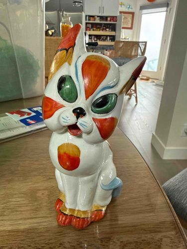 This is a stylized ceramic figurine of a cat, characterized by its playful Mid-Century Modern aesthetic and vibrant hand-applied glazes. Standing approximately 8-10 inches tall, the piece is constructed from a white earthenware or porcelain body. The feline is depicted in an upright sitting posture with an oversized, expressive head featuring large, almond-shaped green eyes and an open 'meowing' mouth. The color palette is bold, incorporating shades of burnt orange, mustard yellow, and sky blue accents against a glossy white ground. The application of the color follows a 'calico' or abstract patchwork pattern typical of West German pottery from the 1950s and 1960s. One ear is notably larger and more curved than the other, adding to its whimsical character. While no explicit maker's mark is visible from this angle, the style is highly reminiscent of German manufacturers like Goebel or Cortendorf. The condition appears fair to good with some visible chipping or paint loss on the tips of the ears and localized crazing in the glaze, which is common for ceramics of this age. The craftsmanship displays high-quality mold work and free-hand painted details, particularly in the whiskers and eyes, making it a desirable piece for collectors of retro kitsch or vintage European ceramics.