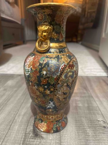 This is a decorative porcelain vase in the Satsuma style, featuring a classic baluster form with a flared rim and a pedestal-style foot. The piece is heavily ornamented with 'moriage' (raised enamel) techniques and extensive gilding. The primary design consists of dense floral patterns, including peonies and chrysanthemums, in a rich palette of iron-red, cobalt blue, and green over a dark, textured charcoal-black background. A prominent feature is the pair of gilded dimensional lion-head handles (shishi) holding fixed rings positioned on the neck. The central body features a framed cartouche containing what appears to be a landscape or character scene, bordered by delicate gold beading. The construction suggests it is a mid-to-late 20th-century ceramic export, possibly from the Showa era, rather than an antique Meiji-period piece. In terms of condition, there is visible wear to the gilding on the rim and lion-head handles, along with characteristic light crazing in the glaze. The base shows a geometric decorative band typical of mass-produced Satsuma revival wares. No maker's mark is visible from this angle, but the quality of the application suggests factory-controlled craftsmanship intended for the decorative export market.