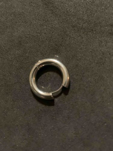 This item is a single, small-diameter huggie-style hoop earring, characterized by its thick, tubular cross-section and high-polish silver-tone finish. Based on its appearance and metallic luster, the material is likely stainless steel or sterling silver. The earring features a functional mechanical hinge, allowing the circular body to open and snap shut securely over the earlobe. The construction is robust and seamless when closed, exhibiting a minimalist, modern aesthetic popular in contemporary jewelry design. Physically, the item shows a smooth, reflective surface with a slightly rounded interior for comfort. There are visible surface abrasions and fine micro-scratches consistent with regular wear, particularly around the outer circumference. No prominent maker's marks or purity stamps (such as '925') are visible in this orientation, suggesting it may be a mass-produced contemporary piece. The hinge mechanism appears intact though it shows a small gap where the two halves meet. The item's style is unisex and versatile, likely produced within the last ten years, focusing on durability and high-shine appeal rather than intricate ornamentation.