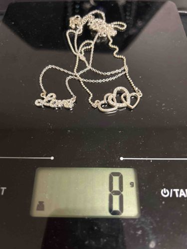 8 grams two separate necklaces both Silvertone with crystal/rhinestones, the necklace with the word love on it is 20 inches long. The one with the three hearts is 16 inches long.