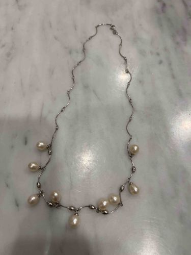 This is a delicate sterling silver necklace featuring nine suspended cultured baroque pearls. The necklace is constructed with a series of curved, S-shaped baton links interspersed with small silver accent beads, providing a fluid and organic aesthetic. The pearls are teardrop and oval-shaped with a soft creamy-white luster and slight surface irregularities typical of natural growth. Given the provided context of '.925', the metalwork is confirmed as sterling silver, exhibiting a bright, polished finish with minimal visible oxidation. The dangles are concentrated toward the front of the chain to create a bib-style draping effect. Based on the assembly and clasp type, this piece appears to be a contemporary or late 20th-century design, possibly manufactured in a boutique setting or a high-quality commercial jeweler. The craftsmanship shows careful attention to balance and movement. Condition-wise, the piece appears to be in excellent used condition with no missing pearls or broken links, though minor surface scratches and faint tarnishing may be present upon microscopic inspection. The pearls seem securely pinned to the link junctions, ensuring durability while maintaining an elegant, airy profile.