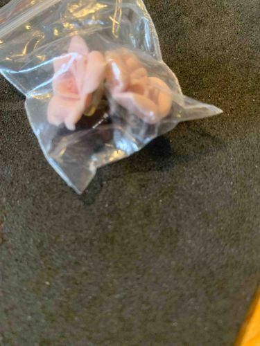 This item consists of a pair of vintage carved earrings shaped like blooming rose flowers, currently stored in a small clear plastic zip-top bag. Each earring features a three-dimensional floral design with meticulously carved petals that flare outward from a central bud. The material appears to be angel skin coral or a high-quality resin or celluloid imitation common in mid-century costume jewelry, exhibiting a soft, pale pink hue with subtle matte surfaces and slight translucency at the petal edges. The roses are approximately 10mm to 15mm in diameter. While the plastic bag obscures clear view of the backs, they likely feature screw-back or clip-on mechanisms typical of the 1940s-1960s era, as indicated by their size and style. The condition appears fair to good; there are no immediate signs of large fractures, though fine dust and age-related grime are visible within the crevices of the carvings. The craftsmanship shows a high level of detail, particularly in the delicate layering of the petals. No visible maker's marks or metal stamps can be confirmed through the packaging, but the style is reminiscent of Italian-made coral pieces or American costume lines like those produced by Trifari or Coro during the mid-20th century.