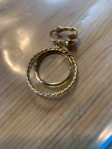 This item is a single vintage drop-style earring featuring a double hoop design suspended from a clip-on mechanism. The earring is constructed from a gold-tone metal, likely brass or a similar alloy with a gold-colored plating. The drop portion consists of two nested hoops: a larger outer hoop with a decorative twisted rope texture and a smaller inner hoop with a smooth, polished finish. The hoops are connected by a small jump ring, allowing for movement and kinetic appeal. The clip-on fastening mechanism is a standard paddle-back style common in mid-to-late 20th-century costume jewelry. While no visible maker's marks are present in the image, the style and construction are indicative of mass-market costume jewelry from the late 1960s to the 1980s. The condition appears fair to good; there is visible surface wear to the plating, particularly on the inner smooth hoop where some minor pitting or tarnish is occurring, and slight dulling of the finish on the clip mechanism. The twisted outer hoop maintains its reflective quality well, showing decent craftsmanship for commercial fashion jewelry. This piece exemplifies the bold, geometric trends popular in mid-century costume accessories.