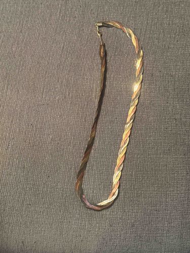 This is a vintage style tri-color gold necklace featuring a classic braided herringbone design. The piece is constructed from three distinct strands of sleek, flat herringbone chain in yellow, rose, and white gold tones, which have been tightly interwoven to create a textured, rope-like appearance. Based on the provided context, the item was manufactured in Korea, a region known for producing high-quality gold jewelry throughout the late 20th century. The necklace features high-polish finishes that enhance light reflection across the metallic surfaces. It is secured by a traditional lobster claw or spring ring clasp assembly with rounded end caps. Physically, the chain appears to be of a substantial width, likely between 4mm and 6mm. One side of the necklace shows significant dark tarnish or patina, particularly on the white/rose gold strands, which may indicate silver content or localized oxidation depending on the karatage. The construction is flexible but delicate, common for herringbone styles which are prone to kinking if not stored properly. The style is characteristic of the 1980s or 1990s jewelry aesthetic.