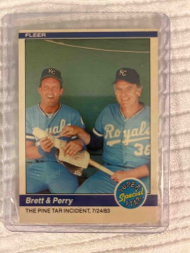 This is a 1984 Fleer baseball card featuring Hall of Famers George Brett and Gaylord Perry. The card is titled 'THE PINE TAR INCIDENT, 7/24/83' and is part of the 'Super Special Star' subset. Physically, the card follows the standard 2.5 by 3.5-inch trading card dimensions, constructed from a thin cardboard stock with a matte finish typical of the early 1980s Fleer era. The front design includes a white border with a blue horizontal banner at the top displaying the 'FLEER' logotype, and a blue banner at the bottom containing the player names and play descriptions. The photograph depicts Brett and Perry in their powder blue Kansas City Royals uniforms sitting in a dugout, playfully referencing the infamous pine tar event with a heavily coated baseball bat. Regarding condition, the card appears to be housed in a protective plastic top-loader, which has preserved its integrity. The centering seems slightly off towards the top-right, a common manufacturing trait of this production year. The corners appear relatively sharp without significant softening, and the colors remain vibrant with no visible surface scuffs or creases from this perspective. This card is a significant piece of baseball lore, capturing a lighthearted moment following one of the most controversial games in MLB history.