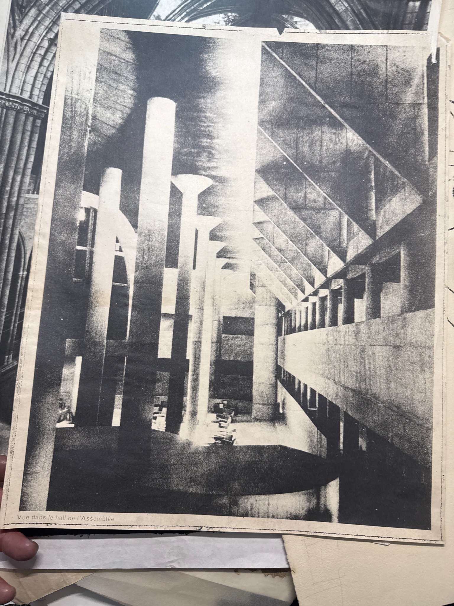 This item is a vintage black and white high-contrast photographic print, likely an excerpt from a French architectural journal or newspaper, featuring a view of the interior hall of the Palace of Assembly (L'Assemblée) in Chandigarh, India, designed by Le Corbusier. The image showcases the iconic brutalist architecture, characterized by towering concrete columns and a distinctive hyperbolic roof structure that allows for dramatic play of light and shadow. The print is monochromatic with deep blacks and bright highlights, typical of mid-20th-century lithographic or offset printing on newsprint or fibrous paper. The caption 'Vue dans le hall de l’Assemblée' is visible in the lower-left corner in a sans-serif typeface. The paper shows significant aging, including yellowing/toning, uneven edges indicating it may have been hand-cut or torn from a larger sheet, and minor creases. The background reveals the print is resting atop other documents, including one showing gothic cathedral arches, suggesting this is part of a collection of architectural reference materials. Based on the typography and subject matter, the print likely dates from the 1950s to the 1970s, coinciding with the peak of Le Corbusier's influence and the international coverage of the Chandigarh project.