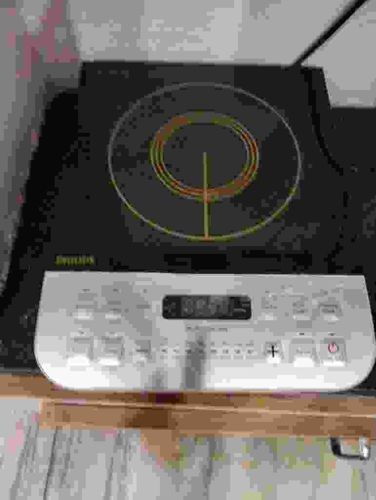 This item is a Philips portable induction cooktop, a compact kitchen appliance designed for efficient electric cooking via electromagnetic induction. The unit features a sleek black ceramic glass top surface, which is characterized by a distinctive gold and red concentric circle graphic indicating the primary heating zone. The lower section of the device consists of a prominent silver-toned control panel with a digital display screen at the center. This panel includes various tactile or touch-sensitive buttons for power control, temperature adjustment, and preset cooking functions like stir-fry, slow cook, and steam. Physically, the item appears to be made of a combination of high-grade plastic and heat-resistant glass. The Philips brand logo is clearly visible in gold lettering on the bottom left of the cooking surface. In terms of condition, there are visible surface scratches and some milky-white cloudiness on the glass plate, likely caused by repeated use or contact with abrasive cookware. There is also significant wear on the control panel, specifically some fading and surface grime that suggests regular domestic use. The style is modern, likely dating from the mid-2010s. This model is typical of consumer-grade Philips appliances, known for durability and functional design.