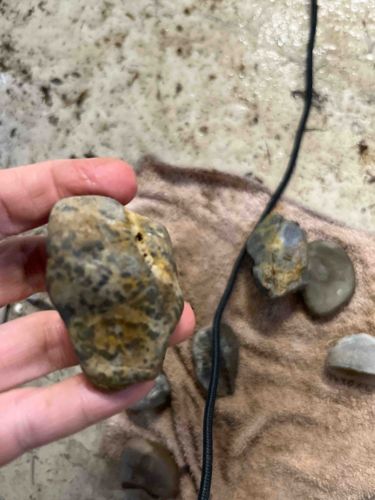 This item is a natural geological specimen, specifically a weathered chert or flint nodule, held in a person's hand for scale. The specimen exhibits a multi-tonal color palette including shades of olive green, brownish-tan, and darker gray patches. The surface texture is notably rugged and irregular, showing signs of heavy natural weathering and possible river-tumbled abrasion. A prominent creamy-yellow mineral vein or inclusions line runs vertically across the surface, possibly representing a quartz or calcite fill in a pre-existing fissure within the host rock. The specimen appears to be approximately 3 to 4 inches in length and possesses an amorphous, sub-angular shape typical of sedimentary nodules. There are no man-made markings, signatures, or manufacturer stamps, as this is a natural formation. The condition identifies it as a raw mineral specimen with significant natural patina, dirt, and surface oxidation. The age of such geological formations typically spans millions of years, originating from the deposition of silica-rich fluids within sedimentary rock layers. The piece lacks the refined lapidary work of polished stones, retaining its raw, earth-mined aesthetic.