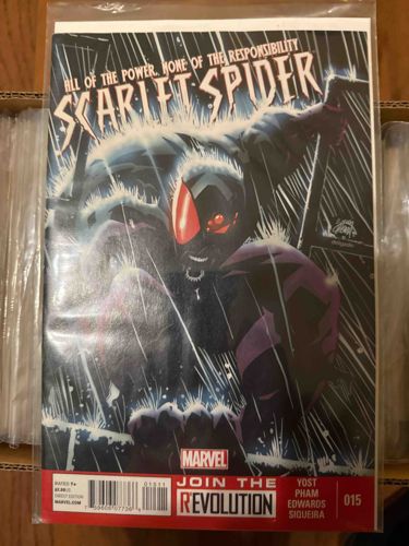 This is a standard modern-age comic book published by Marvel Comics, featuring the Scarlet Spider (Kaine Parker). The cover art depicts the character in a crouched, aggressive stance amidst falling rain, characterized by a dark and moody color palette of deep blacks, greys, and vibrant reds from the character's eye lenses. The title 'SCARLET SPIDER' is rendered in a stylized, jagged font at the top. This specific issue is part of the 'Join the Revolution' branding seen in the bottom red banner and is numbered 015. Notable creators credited on the cover include writers and artists Yost, Pham, Edwards, and Siqueira. The physical item appears to be in its original semi-glossy paper format, housed within a protective clear plastic polybag with a white backing board, suggesting careful preservation by a collector. The condition appears quite good with no immediately visible spine stresses or significant corner blunting through the plastic, though the glare on the bag obscures fine details of the surface finish. It features a retail barcode and a 'Rated T+' age rating in the lower left corner.