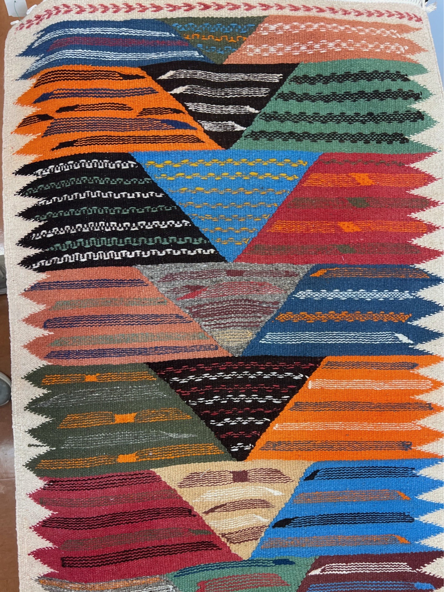 This is a hand-woven flatweave textile, likely a kilim tapestry or small area rug, featuring a vibrant polychromatic geometric design. The composition is structured around interlocking serrated triangular shapes arranged in a rhythmic quilt-like pattern. It is constructed from natural wool fibers on a probably cotton or wool warp, exhibiting various weaving techniques including slit-weave and eccentric weft work to create the jagged diagonal outlines. The color palette is diverse, including shades of burnt orange, indigo blue, forest green, deep crimson, charcoal black, and ochre yellow. Notable details include the horizontal 'lazy lines' or intentional color variations within individual triangles, such as the black section with white sawtooth patterns and the blue section with mustard-yellow dashes. The edges are finished with a flat woven selvage and visible fringe at the top. The item appears to be in good vintage condition with minor edge rippling and slight fading suggestive of a mid-to-late 20th-century origin. The craftsmanship shows high-quality tension control and a sophisticated understanding of folk-art geometric motifs typical of Eastern European or Anatolian weaving traditions reimagined through a modern lens.