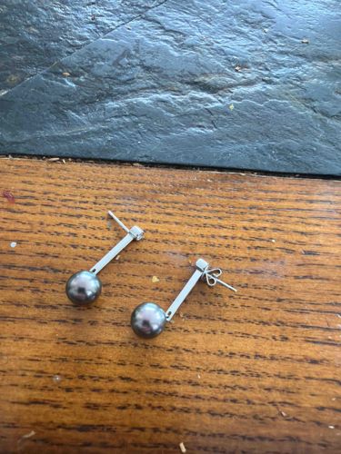 This pair of earrings features a contemporary minimalist design characterized by a geometric vertical bar drop terminating in a round black pearl. The earrings are constructed from a silver-toned metal, likely sterling silver or white gold, though no hallmarks are visible in the photograph. Each earring consists of a small cubic or circular post head that sits on the earlobe, from which a flat, rectangular bar descends. Attached to the bottom of each bar is a single dark pearl, approximately 8-10mm in diameter, exhibiting a lustrous, dark gray to charcoal hue with peacock overtones suggestive of Tahitian or treated black pearls. The spherical shape of the pearls appears uniform and well-matched across both pieces. The construction utilizes a classic post-and-butterfly-nut closure, with one earring missing its back in the image. The condition appears fair to good; the metal surfaces show minor surface scratches consistent with light wear, and there is a slight patina developing on the silver. The aesthetic follows a mid-to-late 20th-century modernist style, emphasizing clean lines and the contrast between the rigid geometric bar and the fluid, organic roundness of the pearl. The overall craftsmanship suggests a designer or boutique jewelry piece rather than mass-produced costume jewelry.