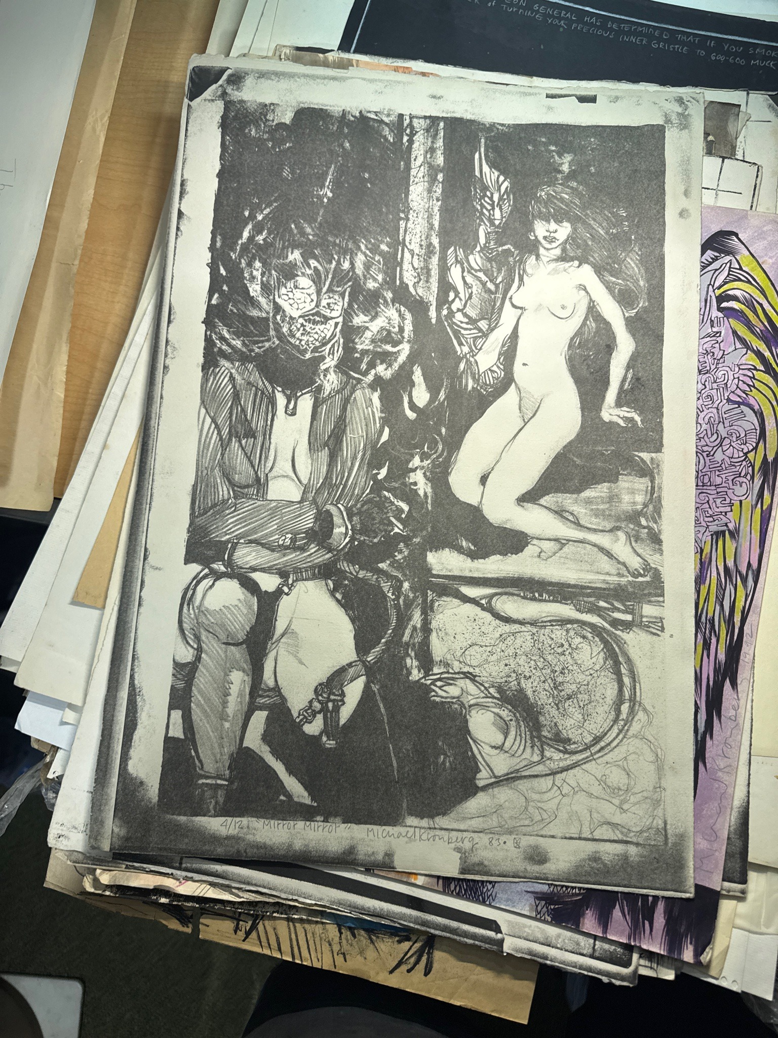 This is a monochrome limited edition lithographed art print titled 'Mirror Mirror' by the artist Michael Kronberg. The piece is numbered 4 out of an edition of 12 (4/12) and is dated 1983. The composition is executed in black ink on off-white or light gray heavy paper stock with visible grain. The artwork features surreal and dark fantasy themes, depicting two female figures: one seated in the foreground with a stylized, mask-like face and heavy linework suggesting clothing or armor, and a second nude figure in the background reclining beside a monstrous or mechanical entity. The style is reminiscent of underground comix or heavy metal aesthetic from the early 1980s, characterized by high-contrast shading and dense cross-hatching. The print is hand-signed by the artist in the bottom margin. The paper shows slight corner wear and minor yellowing consistent with its age, but the ink remains saturated. There are visible registration marks and ink transfer at the very edges of the sheet, typical of a manually pulled lithograph or screen print. The overall craftsmanship suggests a high level of technical skill in printmaking, with deep blacks and intricate fine-line details.