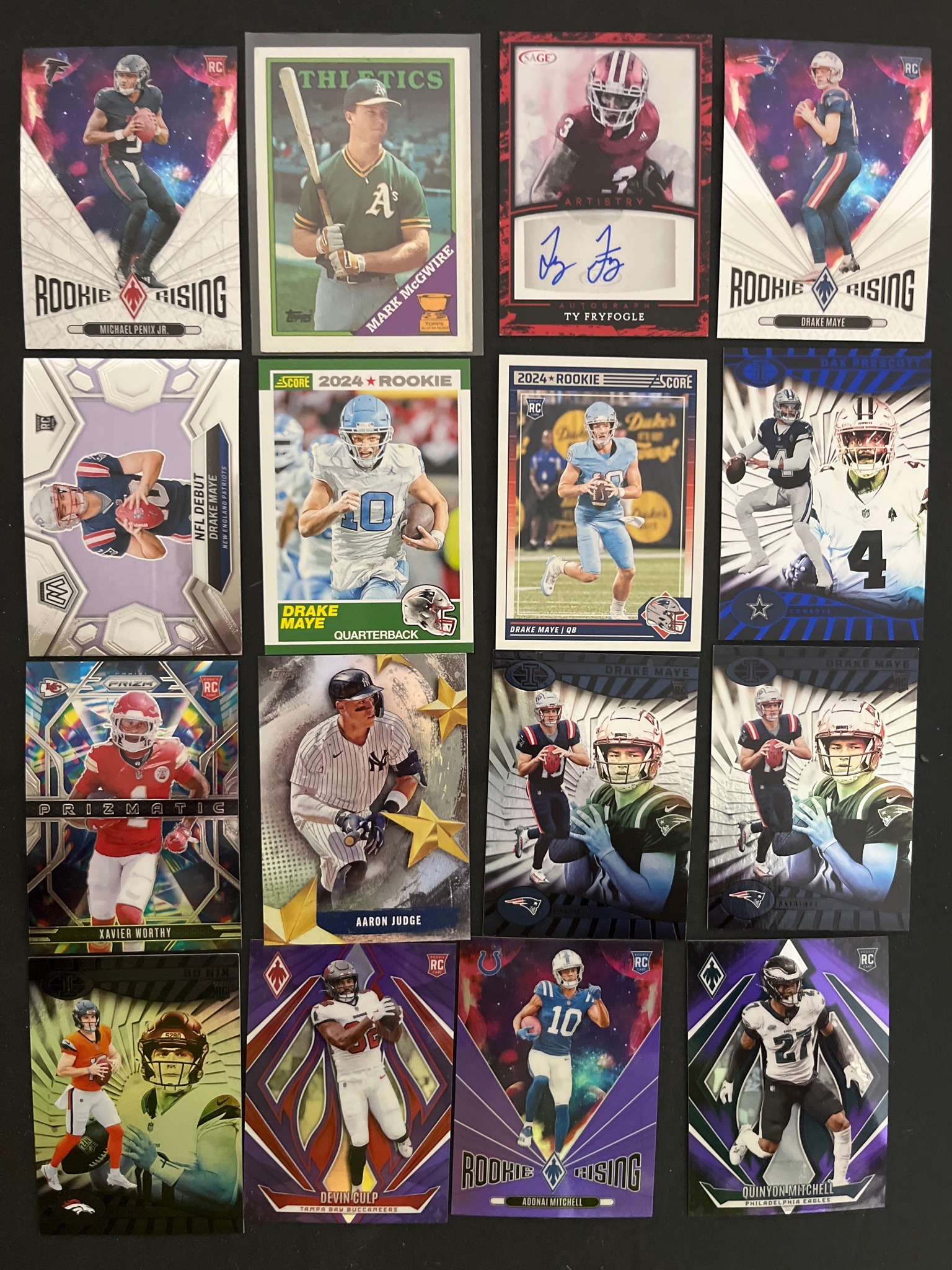 This collection consists of 16 sports trading cards, predominantly featuring 2024 NFL rookie prospects along with notable MLB stars. The group features various modern brands including Panini (Phoenix, Mosaic, Prizm, Illusions), Score, and Sage, alongside a vintage-style 1987 Topps Mark McGwire rookie card and a modern Topps Aaron Judge. A key highlight is the inclusion of several 2024 top draft picks, such as multiple Drake Maye rookie cards, Michael Penix Jr., and Bo Nix. Notable inserts include a Sage 'Artistry' Ty Fryfogle card featuring an on-card blue ink autograph. Physically, the cards exhibit standard 2.5 by 3.5 inch dimensions with diverse finishes including matte paper stock, high-gloss UV coatings, and holographic 'Prizm' chrome technology. Colors are vibrant, ranging from the deep purples and pinks of the Phoenix Rookie Rising series to the classic green borders of the 1987 Athletics card. Condition generally appears excellent to near-mint (EX-MT to NM), with sharp corners and clean surfaces visible on the modern cards, while the McGwire card shows typical light aging. Some cards are protected in clear soft sleeves, indicating an effort towards preservation. The collection showcases high-quality modern printing techniques such as die-cut effects and foil stamping, representing a cross-section of current sports card hobby trends.