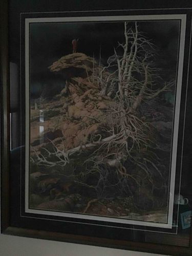 This item is a framed fine art print, likely a limited edition lithograph, featuring the distinct narrative style of renowned western artist Bev Doolittle. The artwork depicts a rugged, rocky landscape under a dark, dramatic sky. A central figure, possibly a Native American warrior in traditional dress, stands atop a prominent rock formation, overlooking an intricate tangle of pale, withered tree roots and branches that dominate the right foreground. The color palette is earthy and subdued, characterized by ochres, tans, and deep grays, with the white of the gnarled trees providing stark contrast. The piece is professionally matted with multiple layers, including a dark outer mat and a thin white inner accent, and is housed in a dark wooden frame. While the specific title is not immediately visible, the composition is highly characteristic of Doolittle’s late 20th-century work (circa 1980s-1990s), known for 'camouflage' art and hidden details. The condition appears stable within the frame, showing no obvious water damage or fading from this viewpoint, although reflection on the glass obscures fine detail. The craftsmanship of the matting suggests a high-quality gallery presentation.