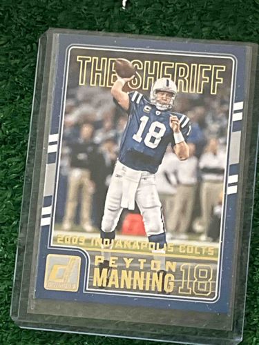 This is a modern sports trading card manufactured by Panini under the Donruss brand, featuring Hall of Fame quarterback Peyton Manning during his tenure with the 2009 Indianapolis Colts. The card utilizes a retro-inspired design with a dark navy blue border and gold-toned typography. The upper portion of the card features the large text 'THE SHERIFF', a popular nickname for Manning, while the bottom identifies the player, team year, and jersey number (18). The graphic includes the Donruss 'D' logo in the lower-left corner. The central image depicts Manning in a classic passing motion wearing the Colts home blue jersey and white pants. In terms of physical condition, the card appears to be housed in a clear protective top-loader. The centering appears slightly heavy toward the left side, which is a common manufacturing characteristic. The corners and edges, as viewed through the sleeve, appear relatively sharp without obvious whitening or fraying, though a detailed out-of-sleeve inspection would be required for a definitive grading assessment. The card reflects a high-quality glossy finish typical of modern Panini production, blending historical themes with contemporary printing technology. No visible surface scratches or creases are discernible from the provided image.