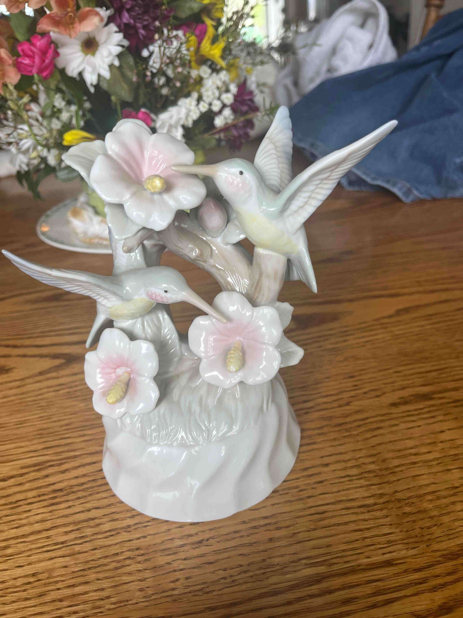 Lladro-Style Porcelain Hummingbird with Hibiscus Flowers Figurine