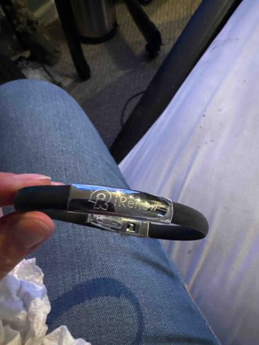 This is an iRenew Energy Balance Bracelet, a piece of wearable wellness technology popular in the early 2010s. The item features a flexible matte black silicone band coupled with a highly polished stainless steel centerpiece. The metal plate is prominently laser-etched with the iRenew brand logo, which includes a stylized 'R' inside a circle followed by the brand name. The construction utilizes a dual-strap design that feeds into a central metal housing with a mechanical clasp mechanism visible on the underside for size adjustment. The metal appears to be surgical-grade stainless steel, chosen for its hypoallergenic properties and lustrous finish. In terms of condition, the metal plate shows minor surface micro-scratches consistent with light use, while the silicone band retains its matte finish without significant rubber degradation or tearing. This product was marketed under the 'biofield technology' niche, claiming to use 'Selective Frequency Resonance' to interact with the body's natural energy field. From a craftsmanship perspective, it is a mass-produced consumer electronic accessory characterized by industrial clean lines and a utilitarian aesthetic, typical of the 'As Seen On TV' era of health gadgets.