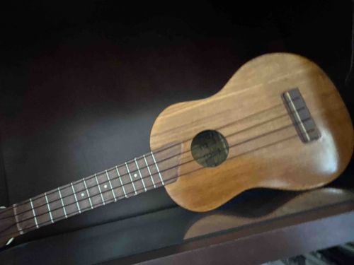 This is a vintage four-string soprano-sized ukulele, likely dating from the mid-20th century, approximately the 1940s to 1960s. The instrument features a body constructed from a warm-toned, honey-colored wood, likely mahogany or a similar koa-alternative, finished with a thin matte or satin lacquer. The soundboard shows a distinct longitudinal grain pattern characteristic of solid wood or high-quality mahogany veneers. The neck is fitted with a darker wood fretboard, possibly rosewood, featuring simple white dot position markers at the 5th, 7th, and 10th frets. The bridge is a classic tie-bar style, also crafted from a dark hardwood. Notably, the soundhole displays an interior label that appears to have black text, though the specific maker's name is not fully legible from this angle; however, the body shape and lack of binding are consistent with production models from brands like Martin, Kumalae, or Harmony during the mid-century era. Regarding condition, the instrument exhibits a soft, aged patina with minor surface scuffs and light play-wear around the soundhole and lower bout. The wood appears hydrated with no immediately visible structural cracks or major seam separations, suggesting it has been kept in a stable environment. The simple, utilitarian construction highlights a focus on tonal resonance rather than ornate decoration, typical of high-quality player-grade instruments from this period.