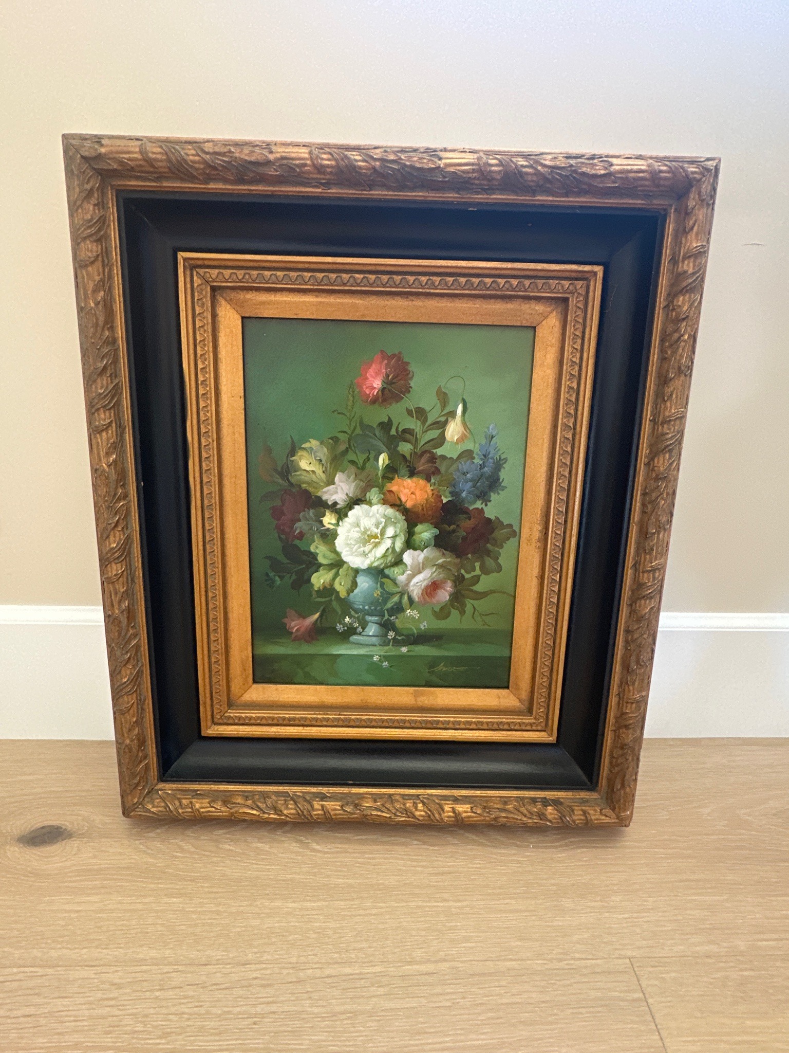 A traditional oil-on-panel or oil-on-canvas painting depicting an ornate floral arrangement in a footed urn, executed in a style reminiscent of 17th-century Dutch still life masters. The composition features a vibrant central white peony or cabbage rose surrounded by orange, red, and blue blossoms set against a deep moody green background. The vessel rests on a dark ledge, and the lighting is dramatic, highlighting the delicate petal textures. The piece is housed in a substantial multi-tiered frame measuring approximately 16x20 inches, consisting of a gilded outer frame with a leaf-and-vine motif, a wide black satin-finish wooden liner, and a gilded inner bead-and-cove fillet. There is a visible signature in the lower right corner, though the artist remains unidentified. The painting appears to be in good vintage condition with a slight surface patina and minor age-related wear to the frame's gilding, including small scuffs and dust accumulation. This contemporary or mid-20th-century homage demonstrates high-quality craftsmanship through its use of impasto and fine brushwork to achieve depth and realism in the botanical subjects.