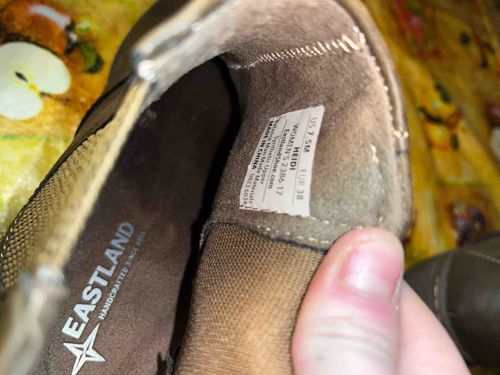 This is a pair of Eastland brand women's boots, specifically the 'Heidi' model, which is a modern interpretation of a classic Chelsea boot design. The upper material is identified as synthetic (man-made) according to the inner tag, designed to mimic the appearance of brown leather with a distressed or matte finish. The interior features a brown fabric lining and a padded insole bearing the 'EASTLAND HANDCRAFTED SINCE 1955' logo. Construction details include visible top-stitching around the collar and side panels, and a brown elastic gore for easy entry. The size is listed as US 7.5M (EUR 38). Manufacturing markings on the inner tag specify the model number 2386-17 and indicate the shoes were made in China. The condition appears used but fair; there is noticeable darkening and light pilling on the interior lining, and the white printed information on the tag shows some wear. The synthetic upper shows typical creasing consistent with regular use. The overall quality represents a mass-market, utilitarian footwear product aimed at comfort and casual style.