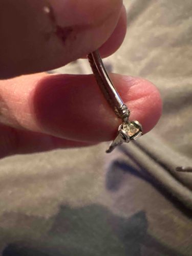 This item is a single, small silver-toned earring, likely part of an incomplete pair. It features a simple linear drop design constructed from a metallic rod or post, terminating in a setting that holds a single, small clear stone. The metal exhibits a bright, cool-toned finish indicative of silver plating, stainless steel, or potentially sterling silver, though no hallmark is visible in the provided image. The stone appears to be round-cut and is secured by a basic prong or tension-like setting, which is integrated into the metal drop. The craftsmanship appears to be commercial or mass-produced, common for contemporary fashion jewelry or late 20th-century costume pieces. The condition shows significant signs of wear and age; there is visible tarnishing, surface grime, and potential oxidation where the metal has darkened, particularly near the joints and the base of the stone setting. The metal rod appears slightly bent or warped. There are no identifiable maker's marks or stamps visible, suggesting it may be a standard department store accessory or an unbranded artisan piece. The overall aesthetic is minimalist and functional rather than ornamental.