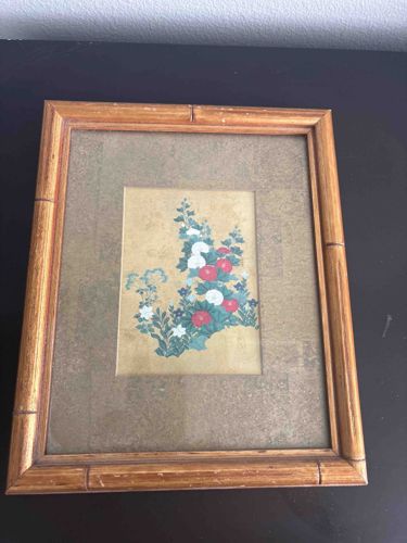 This item is a small rectangular framed artwork featuring a Japanese botanical illustration. The central image depicts a cluster of red and white hibiscus-like flowers amidst green foliage, executed in a style reminiscent of Meiji-period woodblock prints or silk paintings. The print is set against a textured gold or tan-colored matting that appears to have some age-related foxing or mottled discoloration. The artwork is housed in a light-finished wood frame designed with decorative nodes to simulate the appearance of bamboo, a popular motif in Chinoiserie and Japonisme styles. The frame's corners show some slight separation and scuffing, particularly along the bottom edge where the finish has been chipped or worn away, revealing the lighter wood beneath. The glass appears intact but shows slight surface dust. The overall aesthetic suggests a mid-20th-century decorative piece, possibly produced for the export market. The craftsmanship of the faux-bamboo frame is of moderate quality, indicating a mass-produced but stylized home decor item. No visible signatures or maker's marks are discernible from the primary image, although the back of the frame likely contains further structural details.