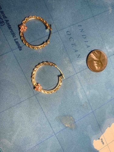 A pair of medium-sized hoop earrings crafted from 10k gold, matching the provided physical context. The earrings feature a distinctive two-tone design consisting of a yellow gold hoop base with an applied rose gold floral accent. The main hoop body exhibits a faceted, diamond-cut texture that provides high light reflectivity and a glittering effect without the use of gemstones. Positioned at the bottom center of each hoop is a delicate rose gold flower bud, likely representing a rose, which provides a contrasting color and a dimensional, sculptural element. The earrings are approximately 20-25mm in diameter, as evidenced by the comparison to the US penny in the frame. The construction utilizes a classic saddleback or latch-back closure mechanism with a hinged post that snaps into a V-shaped notch, ensuring secure wear. The condition appears to be excellent with no visible warping of the hoops or significant tarnishing, suggesting well-maintained modern or late 20th-century craftsmanship. The quality is indicative of fine jewelry intended for daily wear, combining durability with decorative traditional motifs. No specific maker's mark is visible in the distance shot, but the design is consistent with Black Hills style or similar regional gold work.