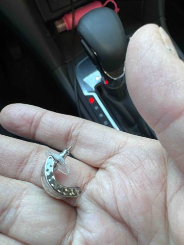 This is a single costume jewelry earring featuring a J-hoop or semi-circle silhouette with a post back for pierced ears. The item is constructed from a silver-toned metal, likely a plated base metal such as brass or pewter, and features a hand-hammered or dimpled texture on the exterior curved surface. This texture creates multiple facets that catch light, giving it a bright, reflective quality despite the lack of gemstones. The earring measures approximately 0.75 inches in diameter. It is secured with a standard butterfly clutch and has a clear plastic stabilizing disc attached to the post to help the earring sit flush against the earlobe. The interior of the hoop appears smooth and polished. Condition-wise, the plating shows some signs of darkening or possible tarnish in the recessed dimples, which is common with silver-toned costume jewelry of this age. There are no visible maker's marks or stamps identifying the designer or metal purity, suggesting it is a commercial fashion accessory from the late 20th or early 21st century. The overall craftsmanship is consistent with mass-produced boutiques or department store jewelry lines.