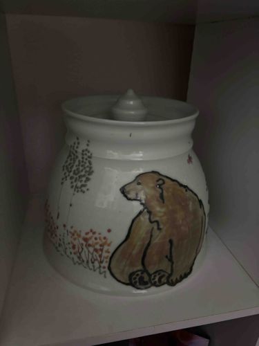This is a handmade stoneware cookie jar or kitchen canister featuring a bulbous body and a recessed lid with a central finial knob. The vessel is constructed from white or light-colored ceramic clay and finished with a high-gloss transparent glaze. The primary decorative focal point is a large, hand-painted brown bear sitting in profile, rendered with thick, dark slip-trailed or underglaze outlines and watercolor-style brown washes. Beside the bear is a stylized landscape consisting of thin, vertically oriented trees and autumnal red and orange shrubbery, likely applied using a stamping or sponge-painting technique. The jar shows signs of artisan craftsmanship, evidenced by the slightly irregular profile of the turned body and the hand-applied nature of the graphics. Based on the style and glaze quality, it likely dates from the late 20th to early 21st century. The condition appears to be very good with no visible chips, cracks, or heavy crazing, although there are minor manufacturing imperfections in the glaze surface and a small dark mark near the rim. This piece exemplifies functional folk-style pottery with a focus on North American wildlife motifs.