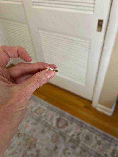 This is a classic five-stone band, typically utilized as an anniversary ring or a wedding band. The piece features five round-cut secondary stones, likely diamonds, graduated in size with the largest positioned in the center. The stones are set in what appears to be a common prong or shared-prong setting, allowing for maximum light entry and brilliance. The band itself is composed of a polished yellow metal, most likely 14k or 18k yellow gold, though a professional acid test or hallmark inspection would be required for confirmation. The shank is relatively thin and tapers towards the back, suggesting a modern or late 20th-century construction. Regarding condition, the metal shows a high-luster finish with minimal visible scratching from this distance, indicating light wear. The stones appear clear and colorless, though a loupe inspection is necessary to determine specific carat weight, clarity, and color grades. There are no obvious signs of repair or missing stones. This style of ring is prized for its symmetrical beauty and timeless elegance, serving as a staple in fine jewelry collections.